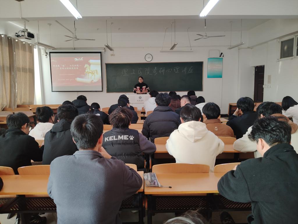 临近考研之际,为了增强考研学子的心理调适能力,缓解紧张焦虑情绪,以更加自信从容的姿态面对即将到来的研究生入学考试,12月9日下午,心理健康中心张晶晶老师莅临理工学院为考研学生作“研途‘载’福,心灵护航”专题讲座,2025年考研学生100余人聆听了讲座。