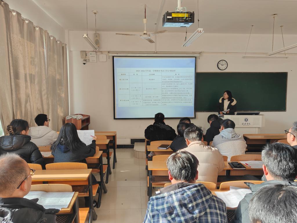教学秘书赵丹就《关于做好2025-2026学年第一学期期末课程考核命题工作的通知》文件作了深入的解读,从命题要求、命题审批程序、试卷命题规范、试卷格式等方面做了详细的培训,并反馈了以往试卷命题中易出现的问题和上学期试卷专项检查的结果,要求老师们要认真、细心,本着负责的态度对待试卷命题工作。实践教学负责人杨潇剑老师向大家讲解了学校、学院关于2026届毕业论文工作的最新要求和规定,主要围绕论文工作量、内容、格式以及工作时间安排等方面进行讲解,并反馈了往年毕业论文中易出现的问题。
