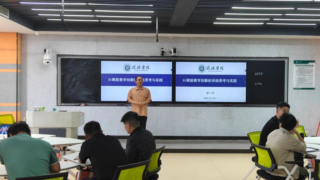 讲座在信阳学院实训中心智慧教室隆重举行,郭教授围绕AI赋能教学创新的“WHY(为何)、WHAT(是什么)、HOW(如何做)”三大核心问题,进行了深入剖析与分享。