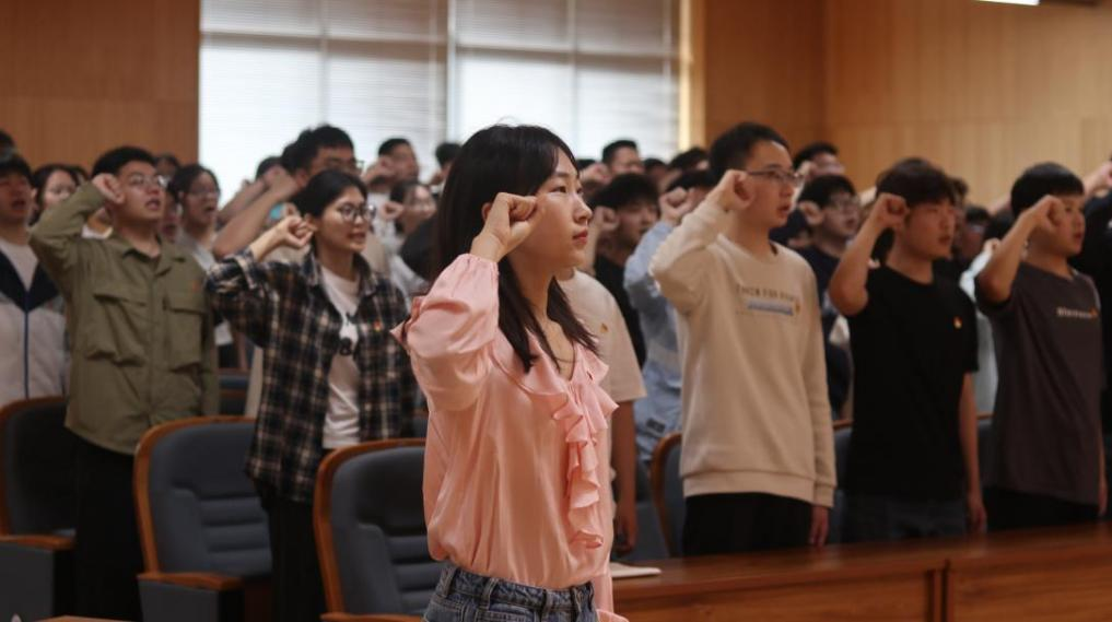 会上,学院党总支在场老师为全体毕业生党员集体佩戴党员徽章。第四学生党支部书记程雯雯带领大家重温入党誓词。