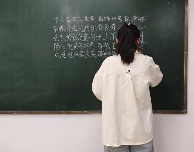 本次比赛分为:毛笔、硬笔、粉笔三个组别,以多元书写形式筑牢反诈防线。主持人为选手们解说比赛规则和注意事项后,宣布比赛正式开始。比赛过程中,选手们屏息凝神,手中的笔在纸上、黑板上挥洒自如。他们的作品内容巧妙融合反诈元素,将防骗智慧融入一撇一捺之间,让传统的书法艺术焕发出崭新的时代生命力。