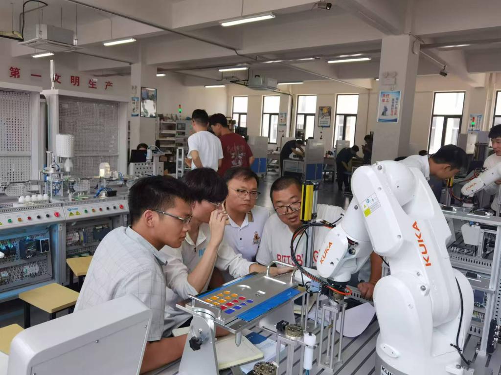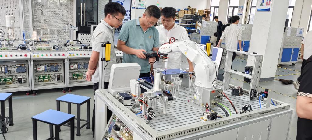 本次培训在生产车间进行,培训内容有工业机器人综合应用实训、现代电气与PLC应用技术实训和模块式智能生产线运维综合实训。培训方式由企业工程师分小组交叉对信阳学院教师进行培训,培训时间同企业员工上班时间一致。