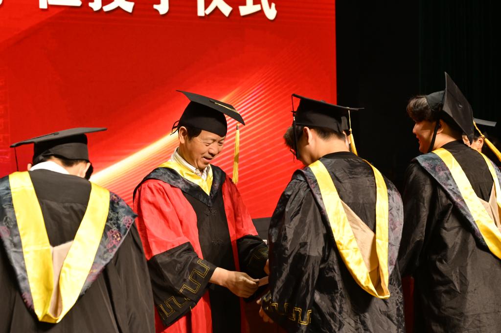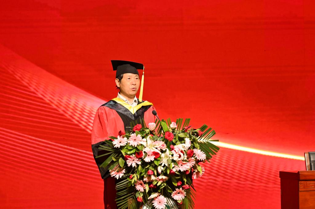 理工学院学位委员会主席、院长肖生发教授发表了致辞。他代表理工学院,向圆满完成学业的398名毕业生致以热烈的祝贺和最美好的祝福。2024届毕业生是非常幸运的一届学子,大家共同经历了学校的本科教学合格评估,亲眼见证了学校的二十年校庆,这样的大事和喜事,同学们都赶上了、参与了,十分幸运!肖院长对将开启新征程的同学们以“律己、善思、慎行”六个字赠予他们,希望2024届毕业生们在今后的人生路上不断进取、勇攀高峰!希望同学们保持自律,让人生在自律中走得更远、更高;希望同学们学会思考、善于思考,“博学而笃志,切问而近思”;希望同学们“慎于言,敏于行”,对自己的决定和行为负责,用自律慎行创造自由。