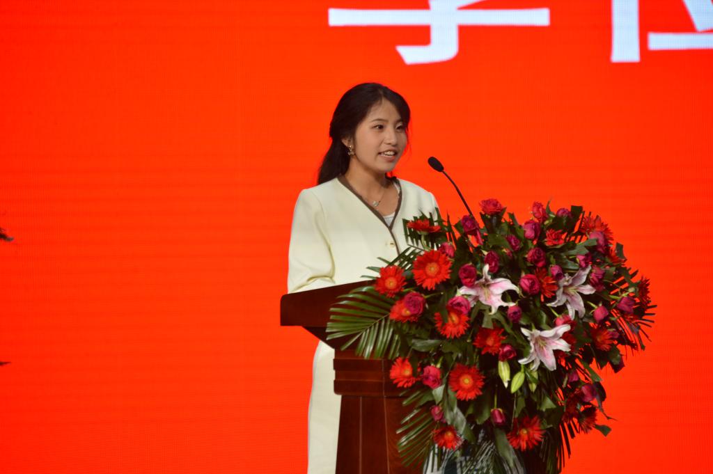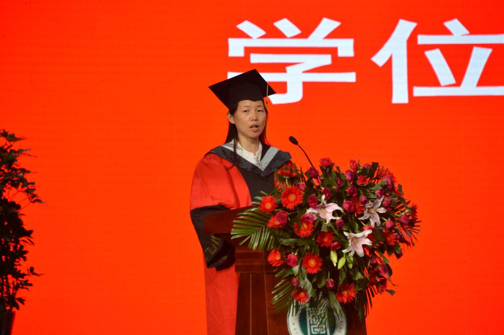 教师代表董玉静博士发言,她对2023届毕业生表示热烈的祝贺,嘱咐每一位毕业生保持顽强的意志、坚韧不拔的精神、积极乐观的态度,要大胆地去尝试,执着地去坚持,果断地去放弃,在不断学习,不断积累的过程中强大自己。