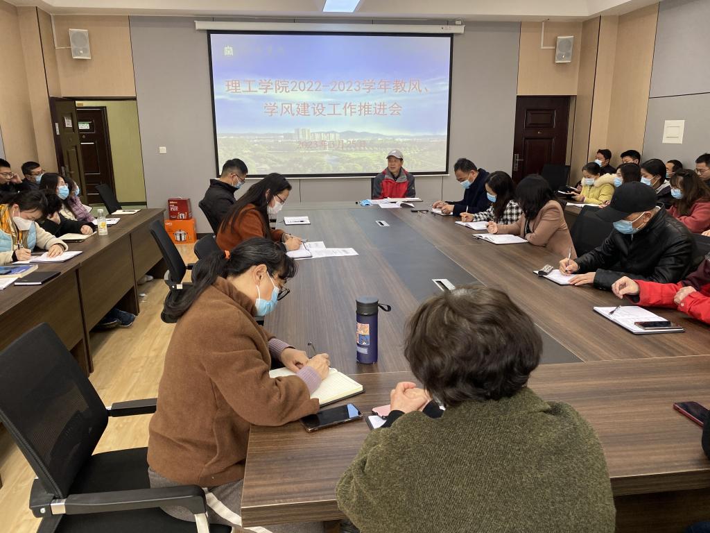 为落实落细立德树人的根本任务,进一步提升教育教学质量和人才培养水平,理工学院于3月25日下午,在理工楼201会议室召开2022—2023学年教风学风建设月工作推进会。会议由行政干事樊瑞主持,全体教职工参加。