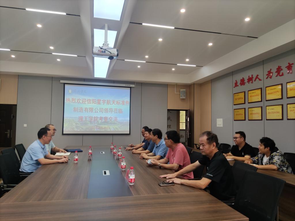 9月30日上午,信阳星宇航天刘德辉副总经理和杨勇副总经理一行到理工学院进行考察交流,双方在理工楼201会议室进行了座谈。理工学院院长肖生发、机械电子工程教研室曹国廷教授、任柏林教授、王仲初教授及全体青年教师参加了座谈会。