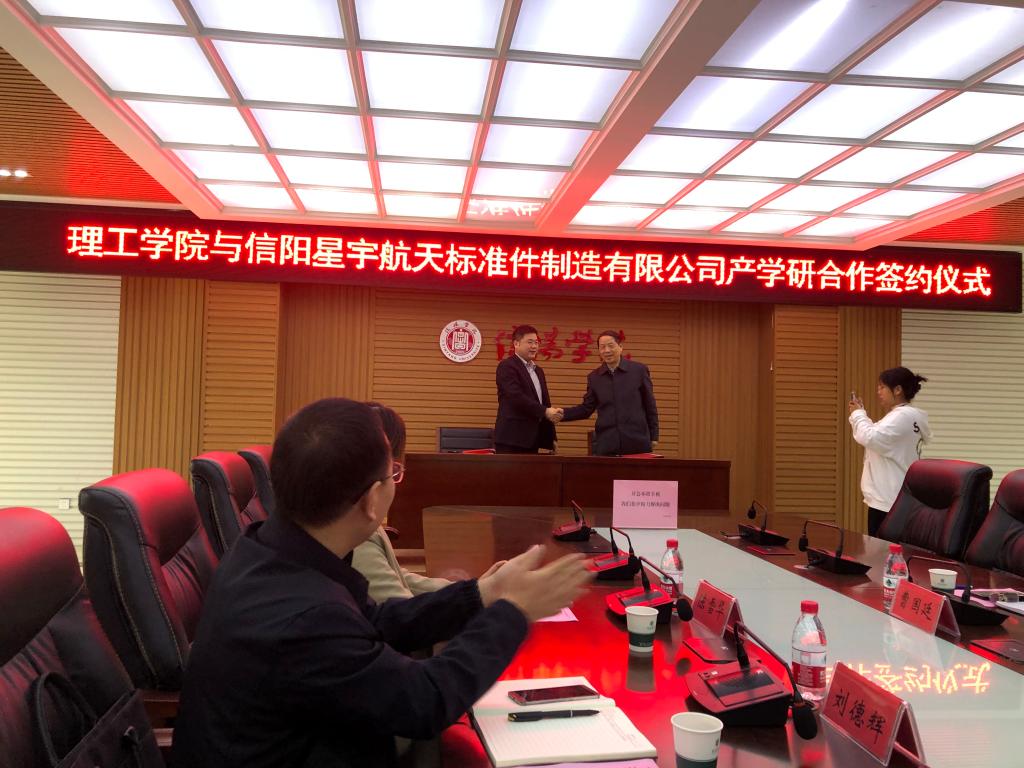 肖生发对信阳星宇航天标准件制造有限公司陈强董事长一行的到来表示热烈的欢迎。他介绍了信阳学院以及理工学院的基本情况、学科专业建设目标、所取得的办学成绩等。肖院长表示希望双方能精诚合作,为社会输送高端人才。