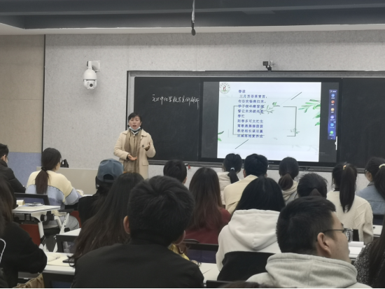 课上,罗老师结合自己的工作实际,以原创的两首诗《春读》和《春忙》开篇,展开了本次的授课。课程深入讲解了初中化学教学的教学思想、教学主张以及四化教学;解析了初中化学课程标准和化学核心素养;总体介绍了化学单元教学设计的方法;共同学习了全国优质课大赛一等奖说播课视频;解析了经典教学案例。课堂上,罗老师与学生互动有序,课堂气氛活跃。罗老师表示:“作为一名教师既要仰望星空,又要脚踏实地。课虽讲了千百遍,仍对每节如初恋的初心践行自己的教育梦想。我们不是作家、不是歌星、不是影视明星,我们拿不出成名作、成名曲、成名剧;我们是老师,我们可以用心设计、用心琢磨、用心执教,拿出值得我们细细回味、慢慢赏析、把每节课都打造成经典课例。”