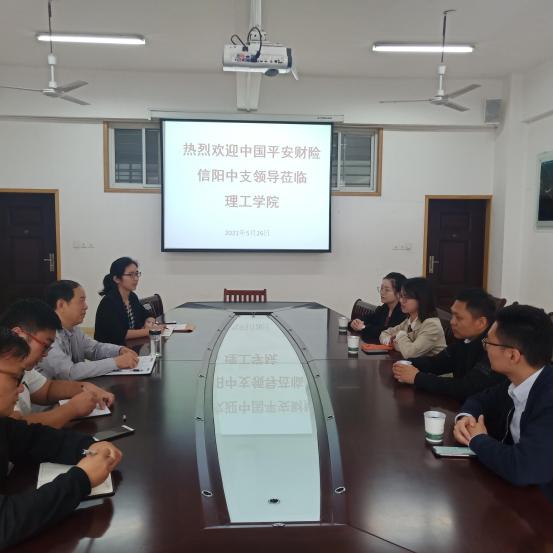5月26日上午,平安产险信阳中支副总经理孟欣一行四人莅临我院考查交流,座谈会于201会议室举行,理工学院院长肖生发、汽车工程教研室部分教师参加座谈交流。