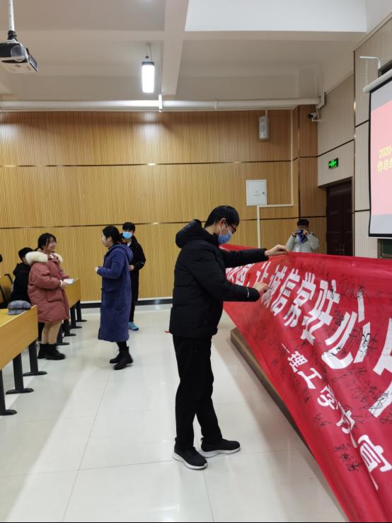 再次,由学生代表马子栋对诚信考试进行发言。然后,副院长李晓严对学生进行考风考纪动员。李院长向同学们介绍诚信考试的重要性,并告诫学生作弊是不可取的,以及作弊对学生以后的影响。临近考试,她希望同学们好好复习,诚信考试,考出自己的真实成绩。最后,参会老师和同学们进行诚信考试签名。