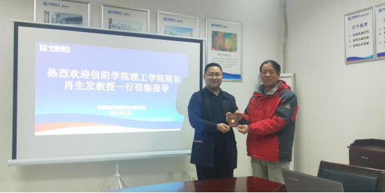 1月13日上午,理工学院院长肖生发教授带领学工秘书杨晓杰,辅导员徐国文和郑亚茹,来到了中原银行信阳中山路支行,看望了校友李卓。李卓于2012年毕业于我院的电子信息工程专业,现任中原银行信阳中山路支行行长。
