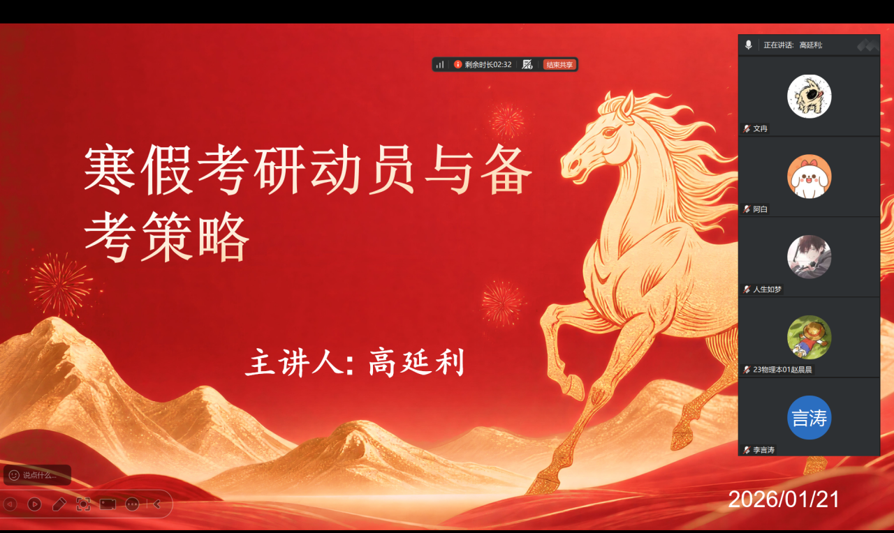 为帮助学生明确考研方向、破解备考困惑,1月21日晚,高延利老师通过腾讯会议,为23级物理班全体同学召开线上考研动员大会。本次大会以“科学规划,蓄力上岸”为核心,为同学们梳理考研脉络、传授备考方法,为其考研征程注入动力。