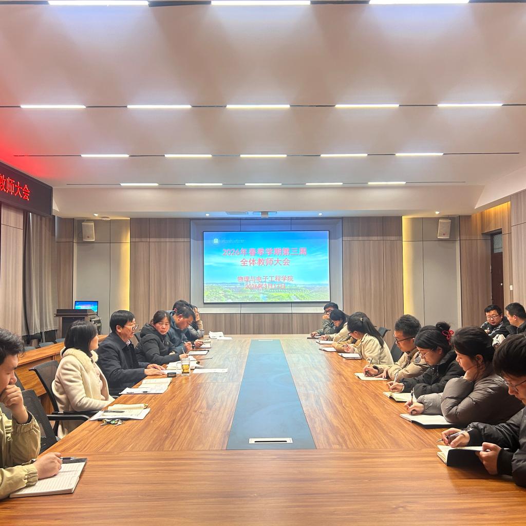 为科学部署2026年学院重点工作,凝聚全院教师育人合力,3月17日下午,物理与电子工程学院在社科楼109会议室召开全体教师大会。学院全体教师参加会议,会议由党总支负责人赵佳主持。