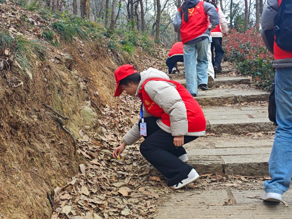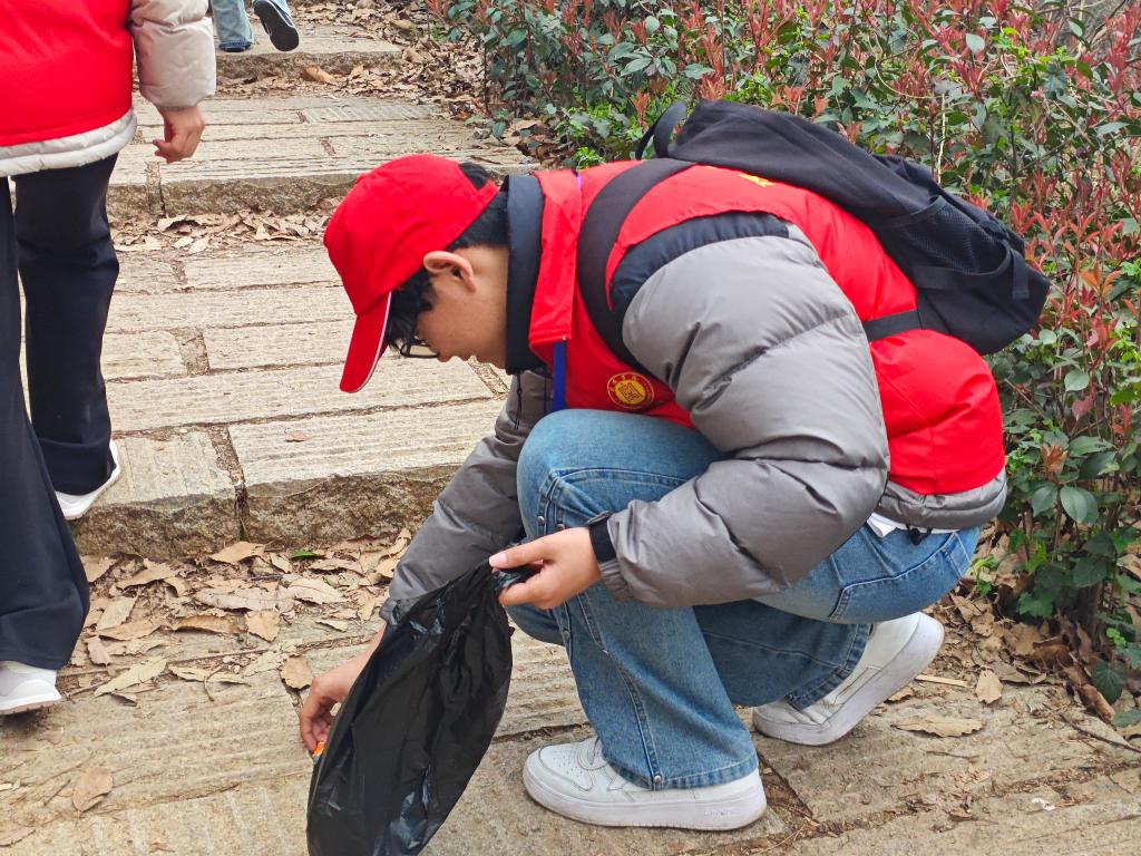 当天下午2点,志愿者们身着统一红马甲,手持清洁工具,齐聚贤山脚下。在负责人的带领下,志愿者们迅速投身护绿行动,沿着山路细致搜寻、认真捡拾沿途垃圾,将散落在山间的塑料袋、烟蒂、废纸屑等杂物清理得干干净净。山林间,志愿者们忙碌的身影成为一道靓丽的风景线,用执着与坚守守护着贤山的每一寸绿意。经过不懈努力,贤山的山林环境变得更加整洁优美,自然风貌尽显清新。