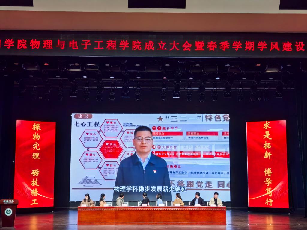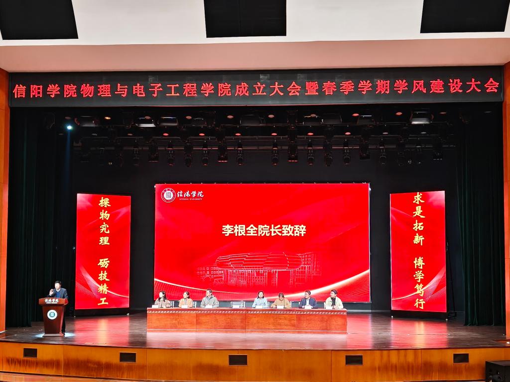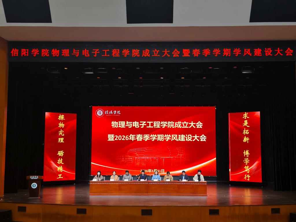 春和景明,万物向荣。3月31日19点,物理与电子工程学院成立大会暨2026年春季学期学风建设大会在浉河校区音乐厅隆重举行。院长李根全、党总支负责人赵佳、教学副院长董玉静及全院师生齐聚一堂,共同见证学院成立的重要时刻。大会由学工干事姜红主持。