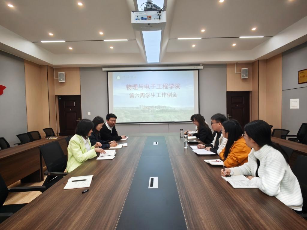 4月7日上午,物理与电子工程学院在理工楼210会议室召开第六周学生工作例会。党总支负责人赵佳、学工干事姜红和辅导员杨翔宇参加了此次会议。