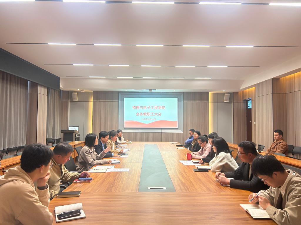 4月14日下午,物理与电子工程学院在社科楼109会议室召开全体教职工大会,院长李根全、党总支负责人赵佳、教学副院长董玉静及全体教师参加了会议,会议由赵佳主持。