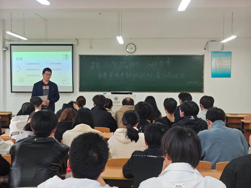 为增强理工学院学生干部对学生工作的认识,激发理工学院学生干部积极向上的工作热情,理工学院于3月23日在理工楼502举行了2025年春季学生干部培训班第三次培训。学工秘书杨晓杰老师主讲此次培训会,理工学院24级本科以及专升本学生干部,学生会干部参加培训。