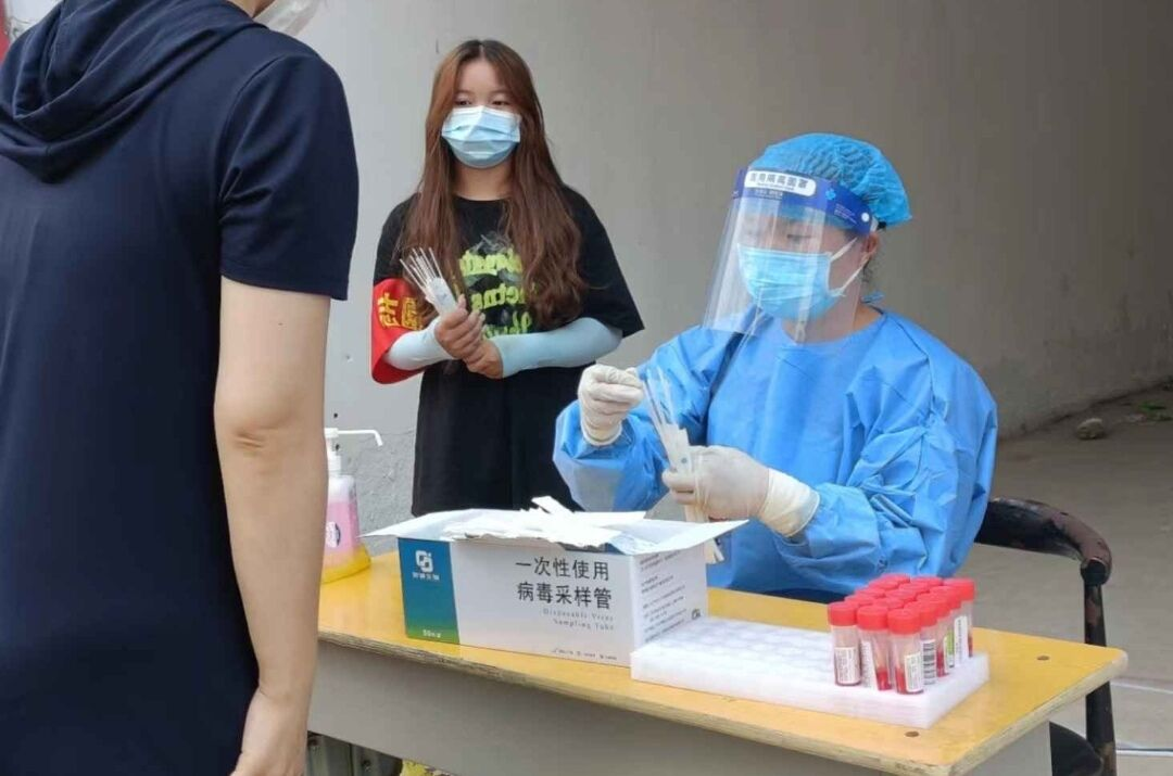 2022年7月13日,理工学院2020级化学本科3班潘雅静同学负责维持核酸检测场所秩序,帮助工作人员核查往来人员的健康码。