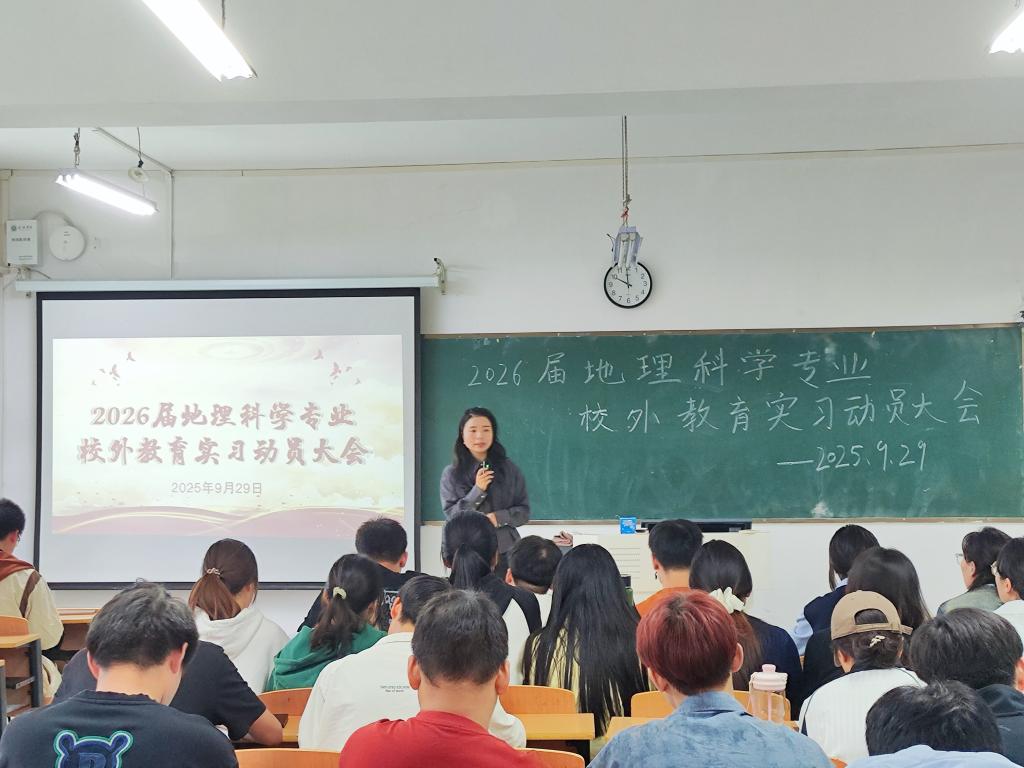 为扎实做好师范生实践教学环节,引导学生明确实习目标和任务,确保教育实习工作顺利开展,9月29日下午,理工学院在理工楼302教室召开2026届地理科学专业本科毕业生校外教育实习动员大会,地理科学专业实习指导教师及2022级95名学生参加动员大会。会议由付霞老师主持。