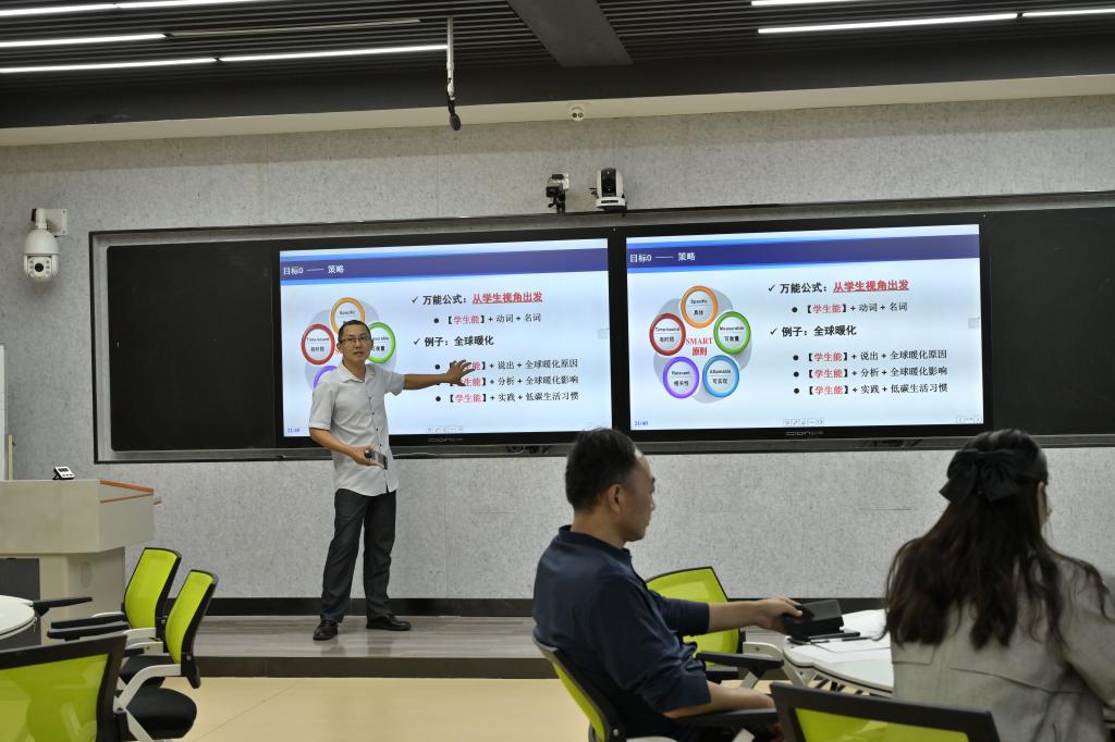郭一鸣教授以“何为有效教学?”开场,详细讲解了BOPPPS有效教学结构中的导入(Bridge-in)、目标(Objective)、课前测试(Pre-assesment)、参与式学习(Participatorylearing)、课后测试(Post-assessment)、课堂小结(Summary)六个模组以及操作要领。郭教授强调,BOPPPS有效教学结构的各个环节相互协作配合,核心理念是以学生为中心,关注全部学生的学习进度和反馈,重视知识的自我构建,最终达成有效学习。讲座过程中,郭教授利用雨课堂进行了实时讨论、投票答题、随机点名、拍照上传等信息化手段与在场教师积极互动,让老师们更好地体验参与式教学的意义,也体验了现代化教学手段对提高课堂教学质量的辅助作用。为帮助研修教师更好地理解和掌握BOPPPS有效教学结构,郭教授与教师们开展了一次迷你演练,根据BOPPPS模块,分组讨论编写教学设计单并对教学内容设计进行了展示解说。教师们的参与度非常高,讨论积极,思维碰撞,工作坊历时两个半小时。