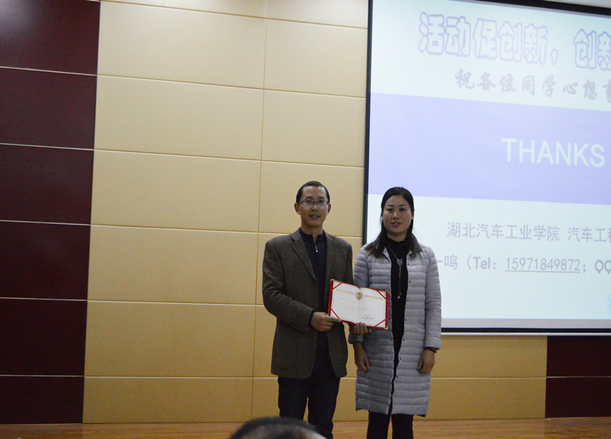 讲座结束后,院领导特邀郭一鸣博士为理工学院汽车类专业学生科技创新指导顾问,院党总支副书记张红梅为郭一鸣颁发了聘书。魏明坤院长做了总结发言,魏院长感谢郭博士为在场师生做的的精彩报告,他告诫大家要按照国家“大众创新、万众创新”战略,学校大学生创新创业要求,结合我院汽车专业实际,培养学生兴趣,提高学生创新意识,有选择的参加汽车类专业大学生科技创新大赛。
