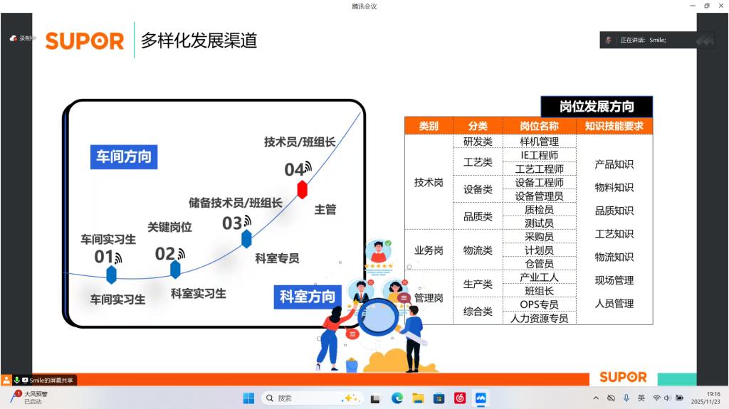 宣讲会上,苏泊尔家电制造有限公司龚经理通过企业宣传片、PPT 演示等丰富形式,全方位展现了公司的发展历程、行业地位、核心业务及未来战略布局。针对毕业生关注的重点,龚经理详细介绍了公司的职业发展体系、人才培养计划、岗位需求方向及薪酬福利政策、培训机制等关键信息,让同学们对企业及招聘岗位有了清晰认知。