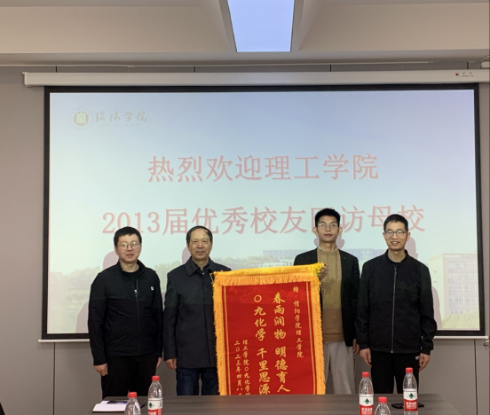 优秀校友代表为理工学院赠送“春雨润物,明德育人”锦旗,以感谢母校和学院的培养。