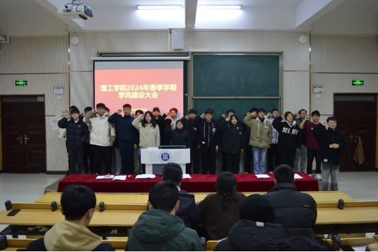 先进班集体代表对学风建设活动作了经验分享,鼓励全体理工人继续保持优良学风。辅导员田亚星老师宣读了《2024年春季学期学风建设策划书》。学生会主席李双瑶宣读了《2024年春季学期学风建设活动倡议》。理工学院全体班长对“争创学风建设先进班集体”进行宣誓。